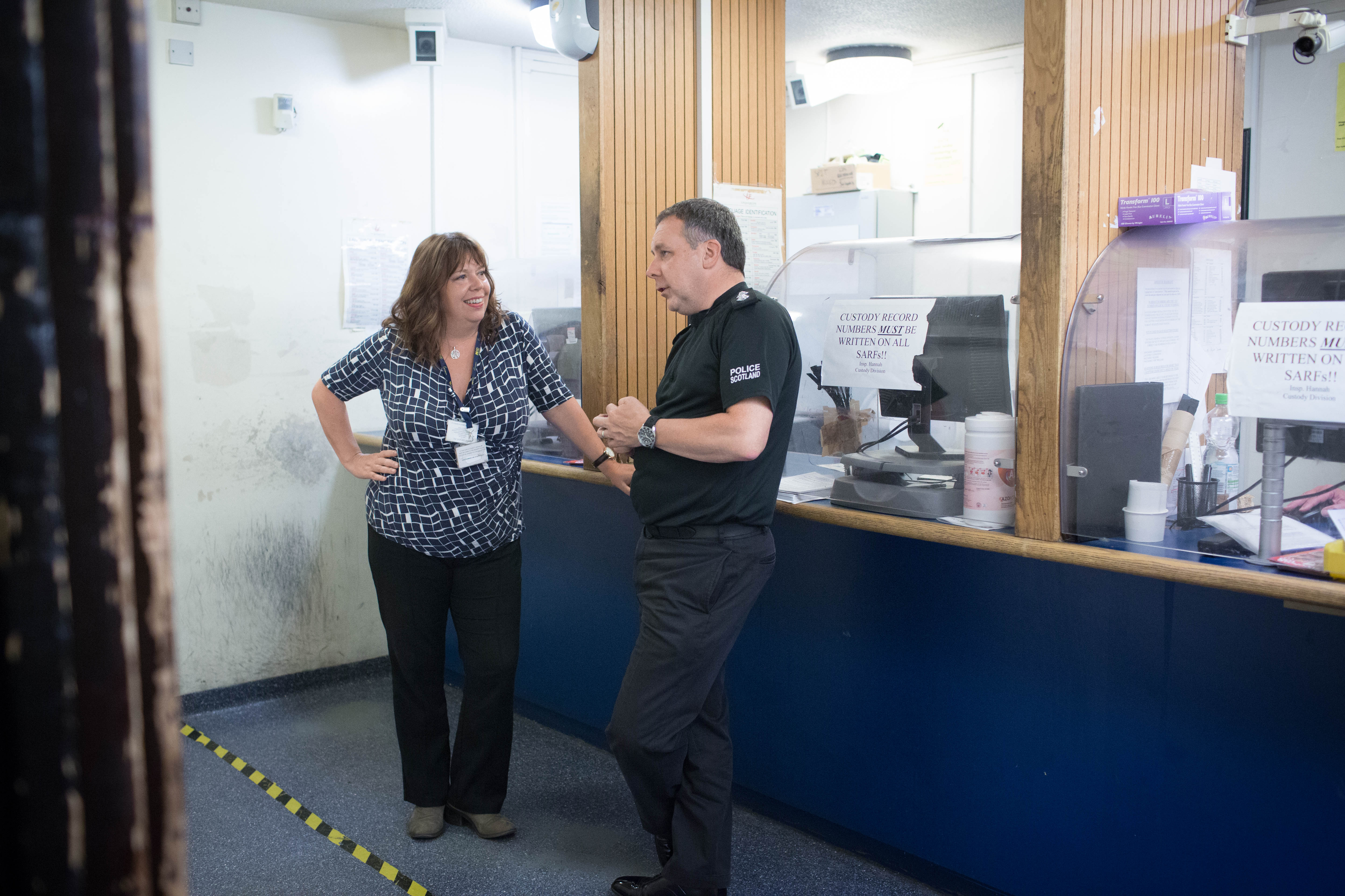 The custody suite below St Leonard’s Police Station in Edinburgh can be an intimidating environment: windowless corridors are lined both sides with thick metal doors, well-worn whiteboards bearing the names of the people behind them. There is a busy charge bar, where people who have been arrested are clerked in, and an office where a bank of security screens is monitored closely.